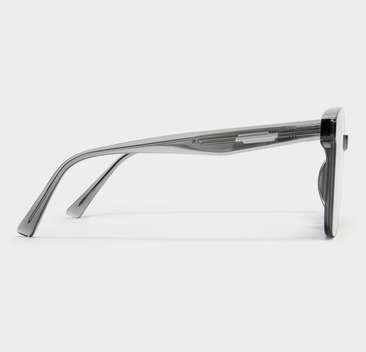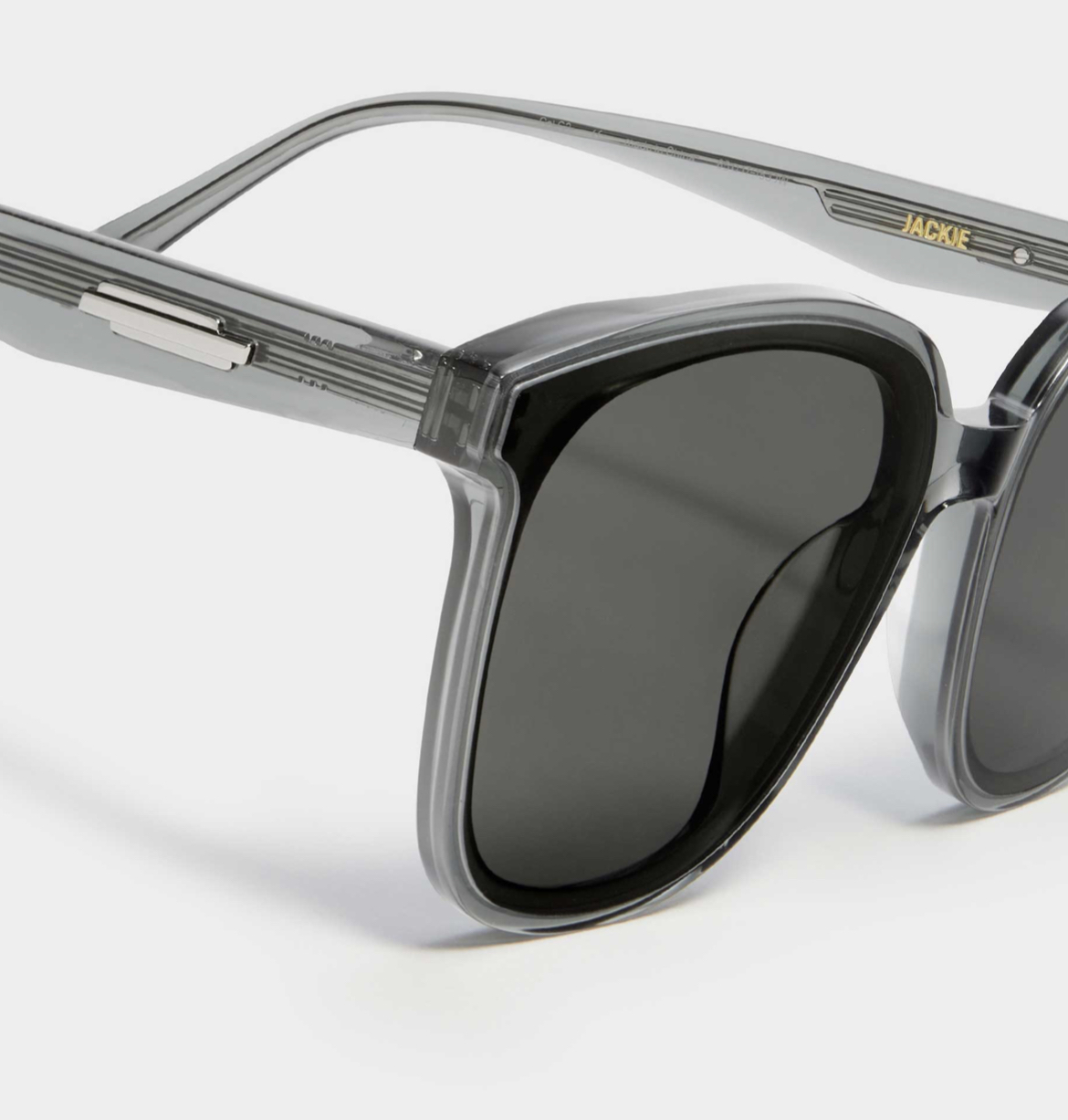 Jackie G3 is a clear grey square acetate Flatba frame with 99.9% UV protected black Zeiss lenses. This versatile design with soft curves and temples decorated with unique metal details is designed to fit any occasion.