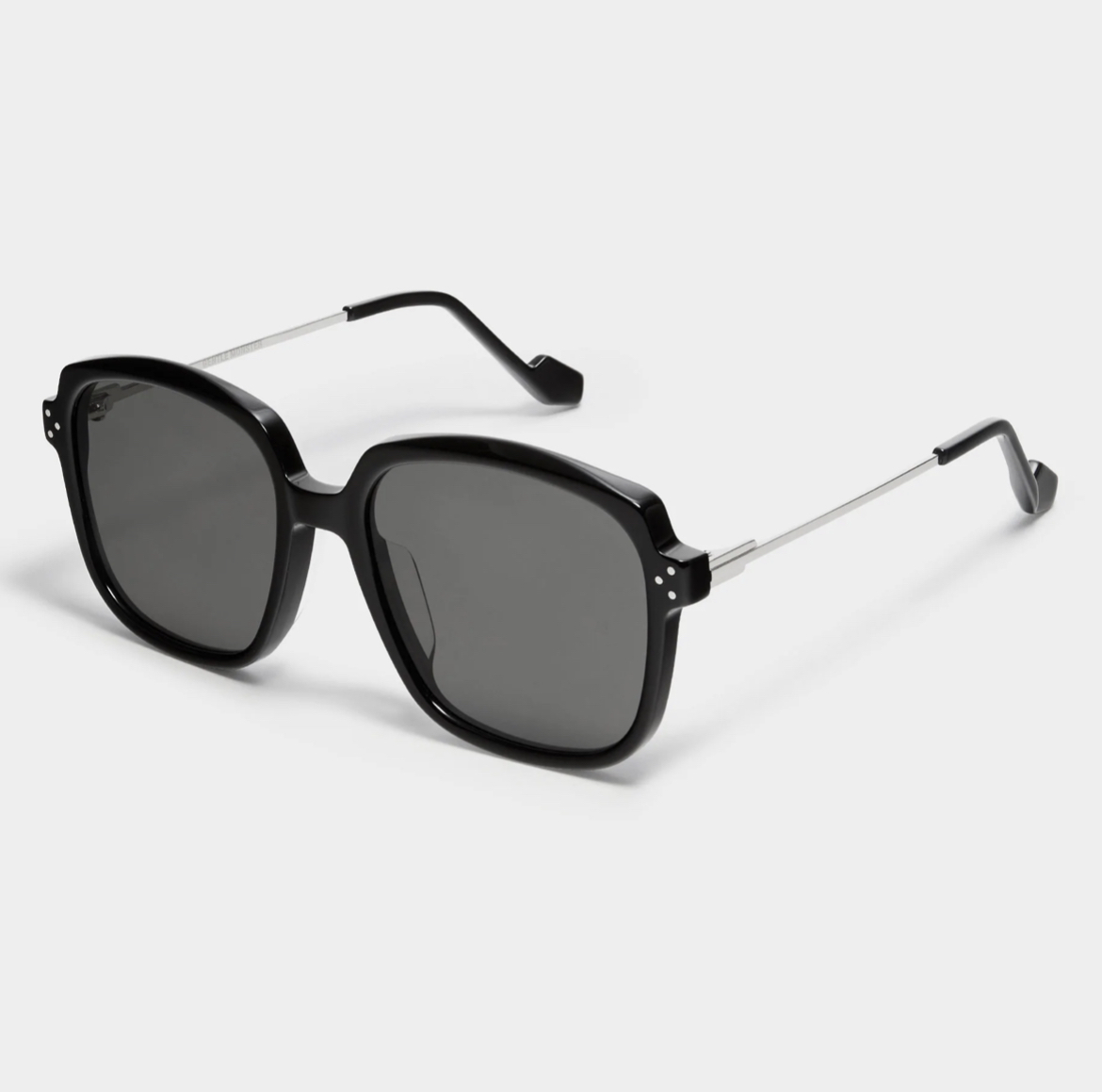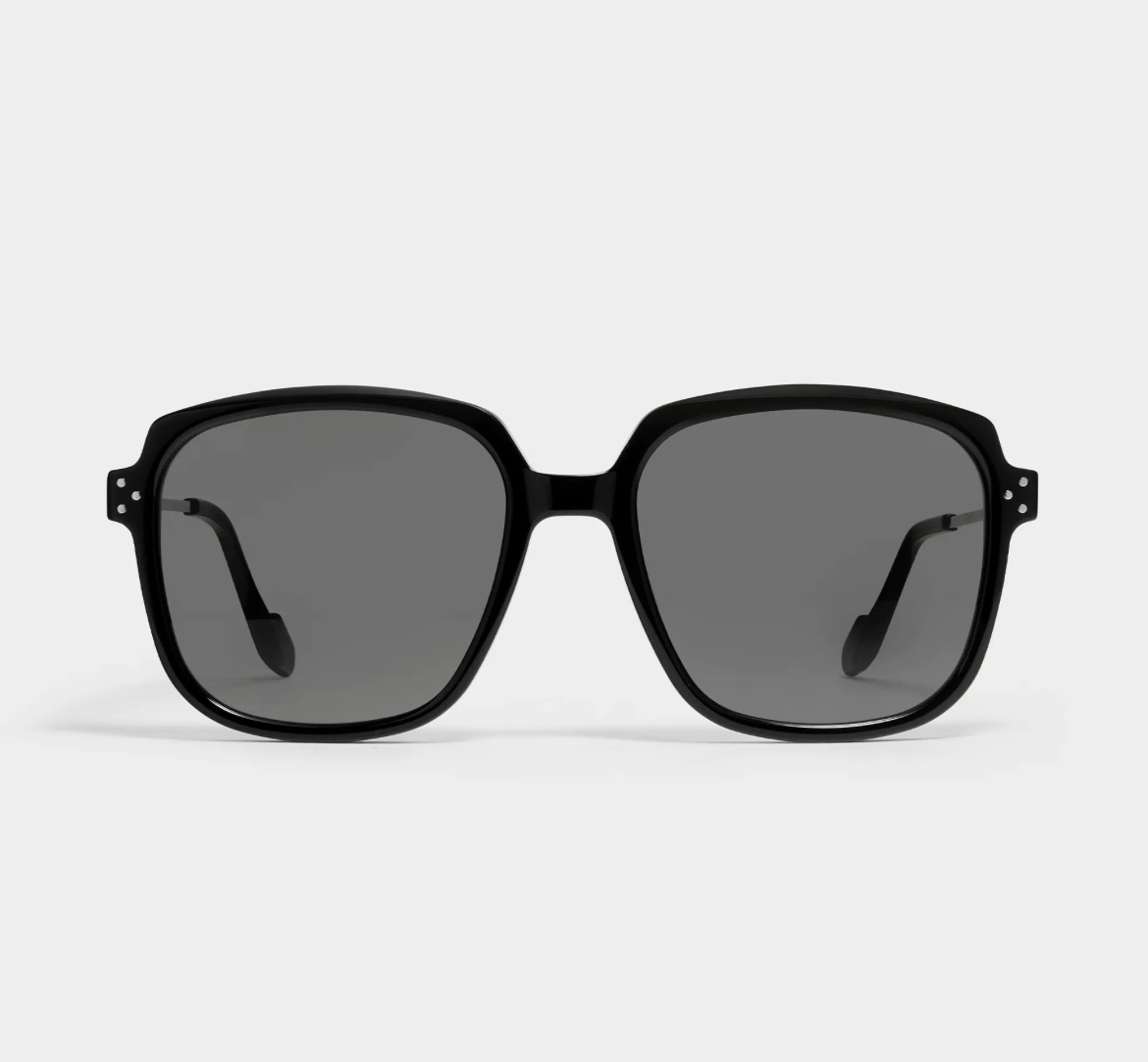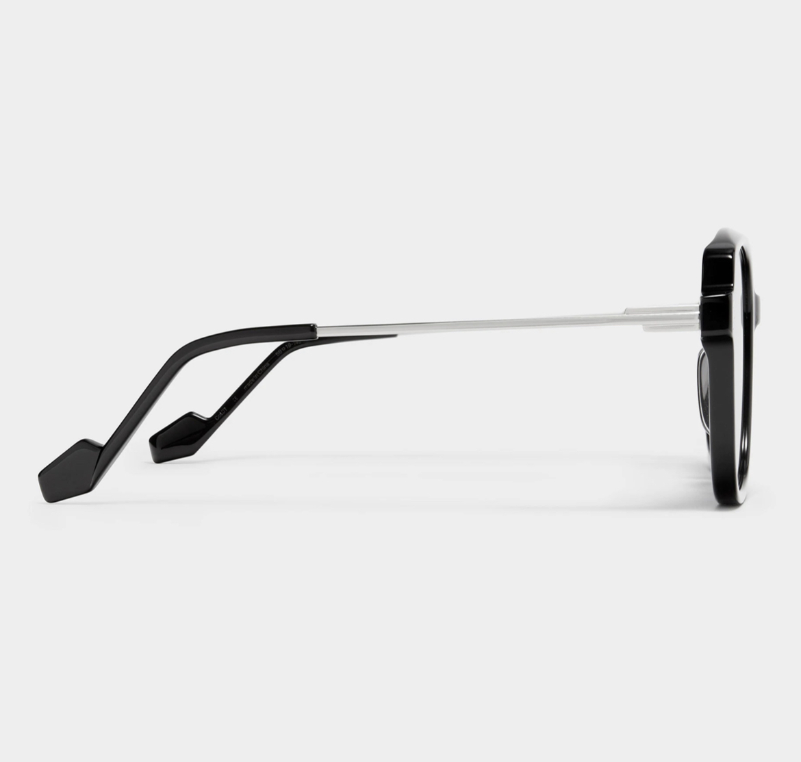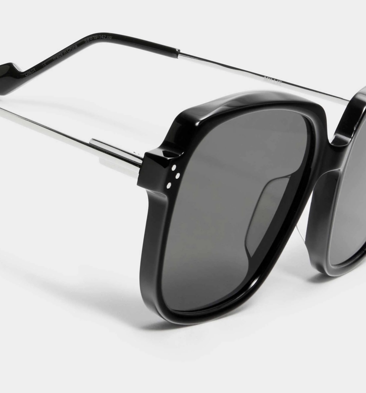 Millie 01 is a square black frame crafted of acetate and metal. The endpiece is accentuated with three circular studs, complemented by uniquely shaped temple tips and 99.9% UV protected black Zeiss lenses.