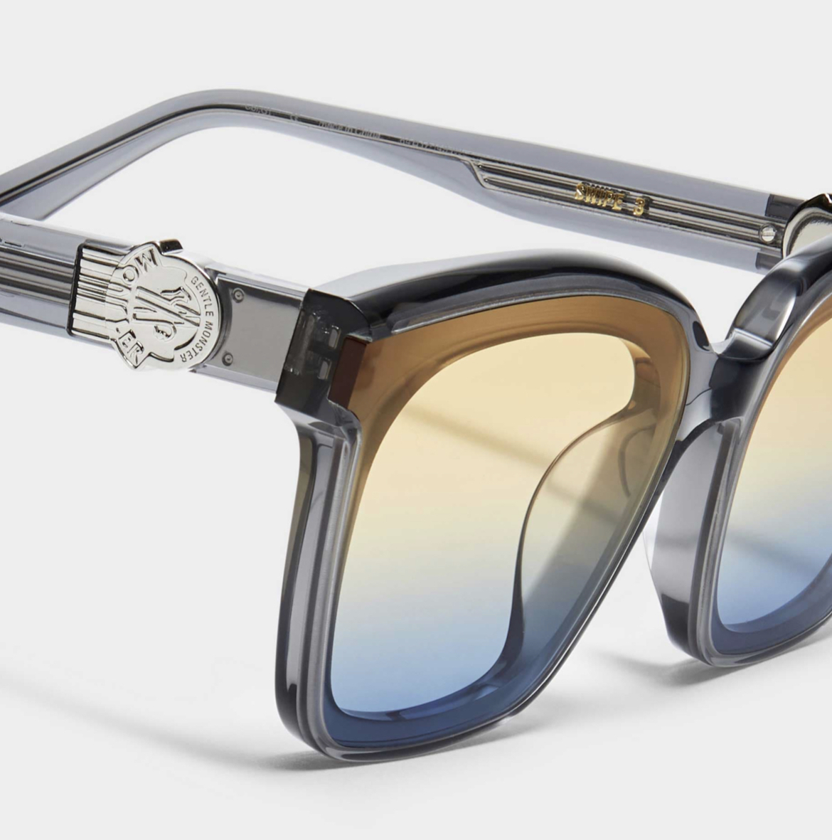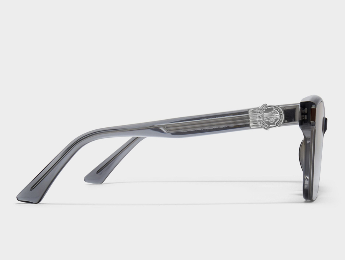 GM and Moncler Presents Swipe 3 G1, a square translucent grey Flatba frame with edgy curves for a modern look. The Moncler Genius Collection metallic logo on the temples highlight the alliance between both brands. Fitted with 99.9% UV protecting orange gradient lenses.