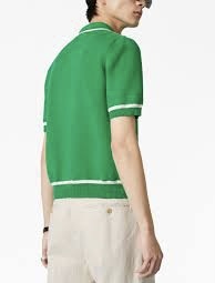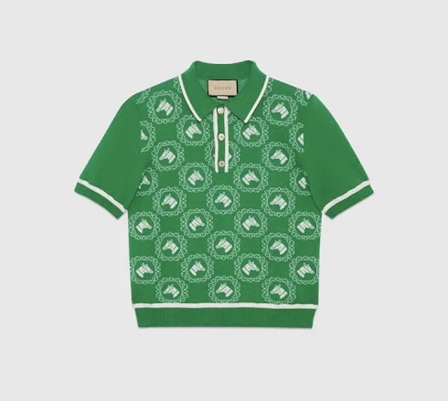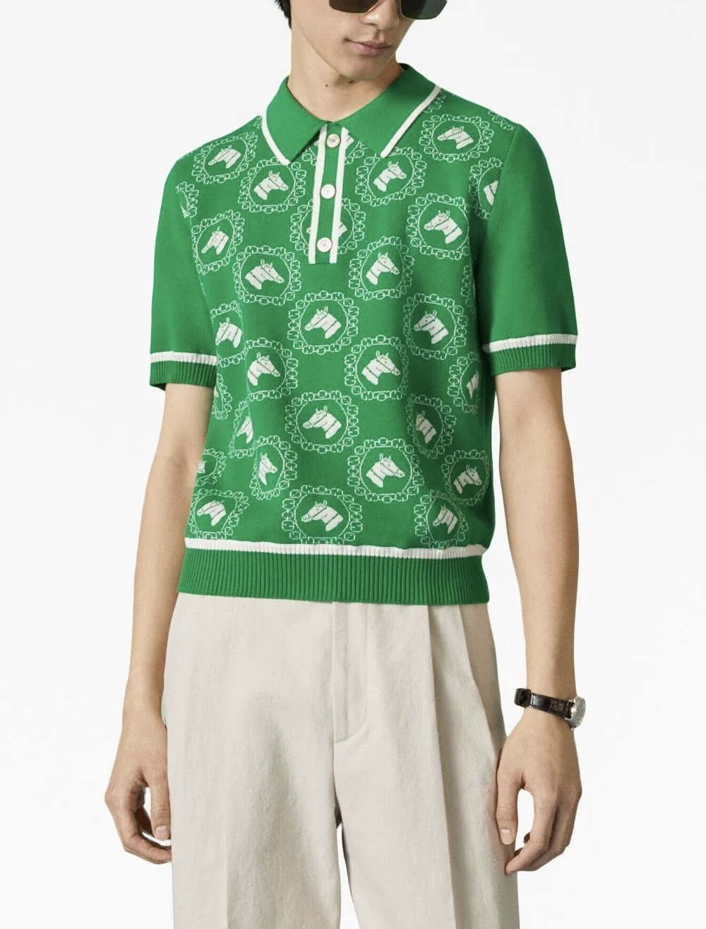 This green-hued polo shirt from Gucci reflects the brand’s fascination with equestrian design codes. Crafted from cotton and wool, the style boasts contrast trims and a pearlized button closure.