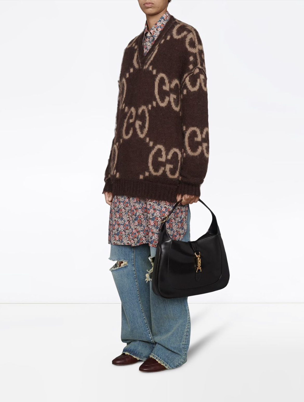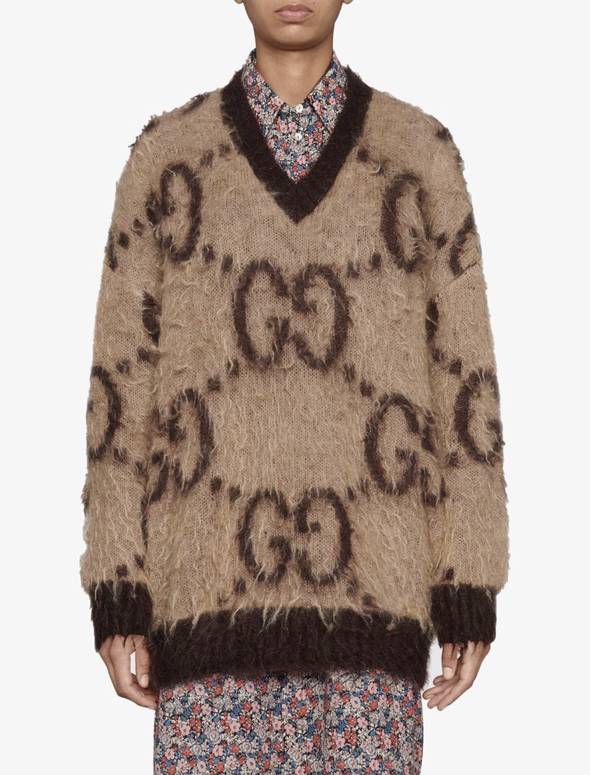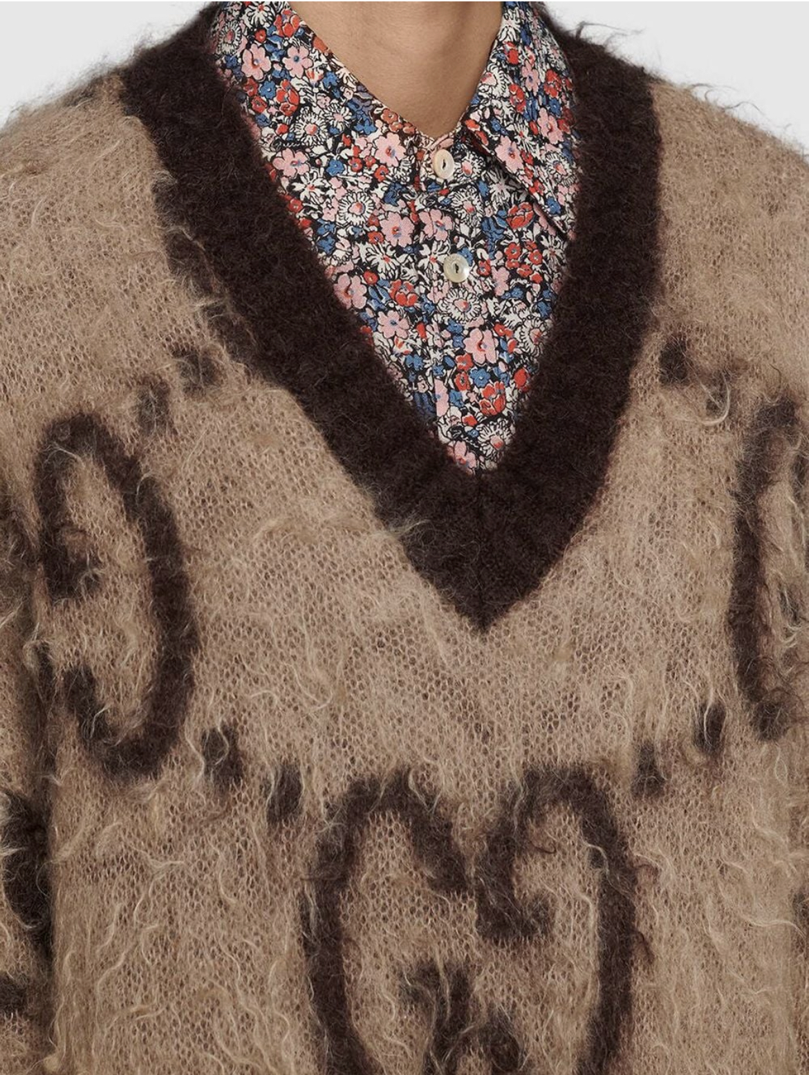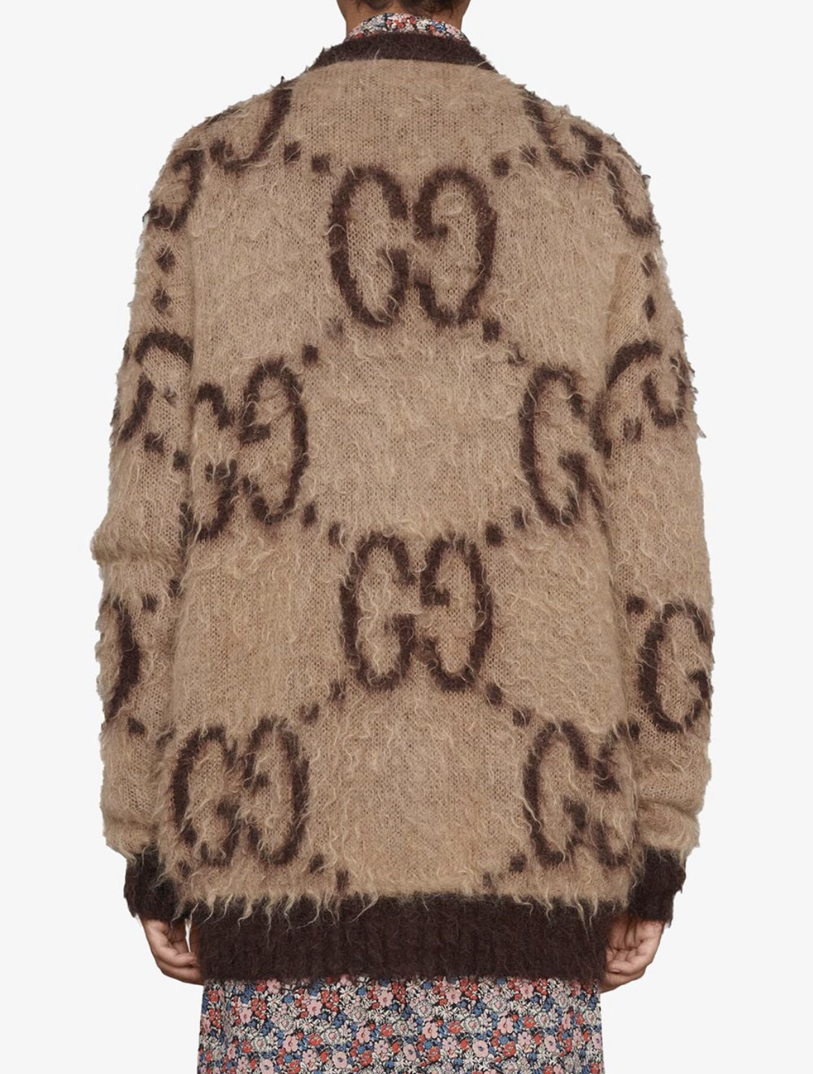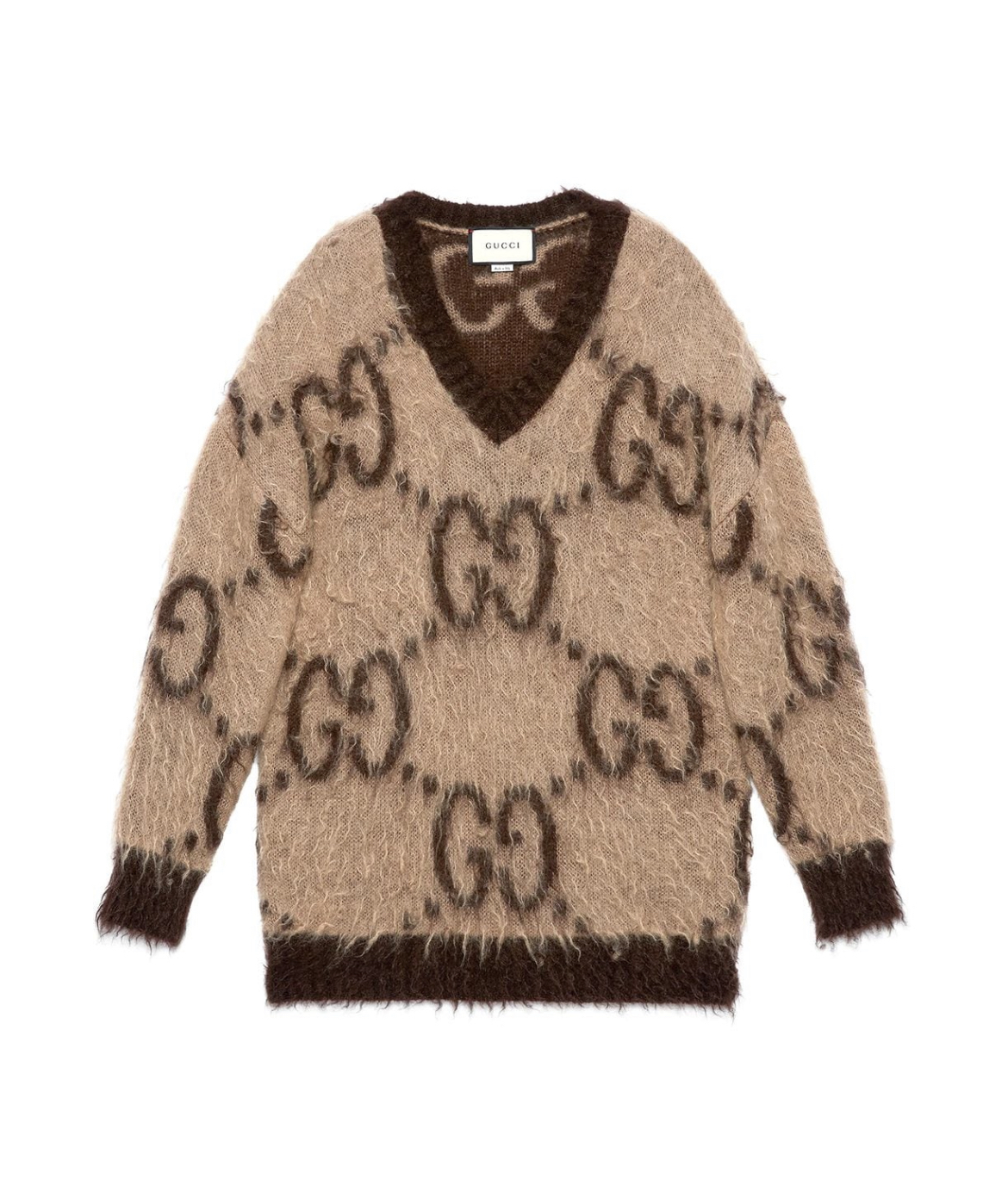 Description: -mohair blend -GG jacquard logo pattern -v neck -drop shoulder -long sleeves -ribbed trims -oversized fit Style id: 639380XKBK2 Color: beige