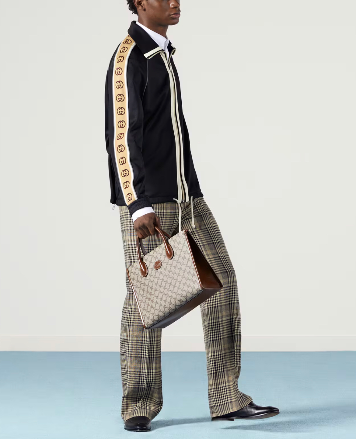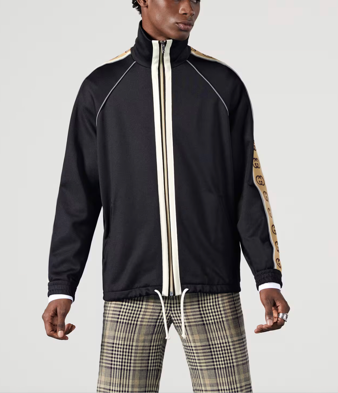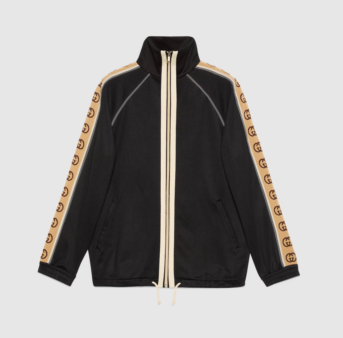 -camel and brown interlocking G jacquard stripe down the sleeves with reflective fabric piping