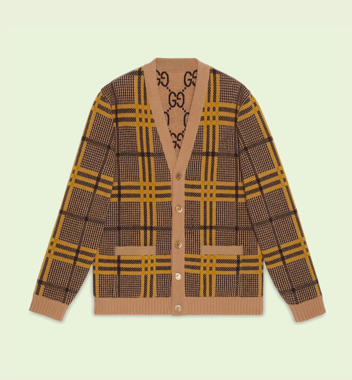 -camel and brown double checked knit wool on one side and camel and brown GG on the other side