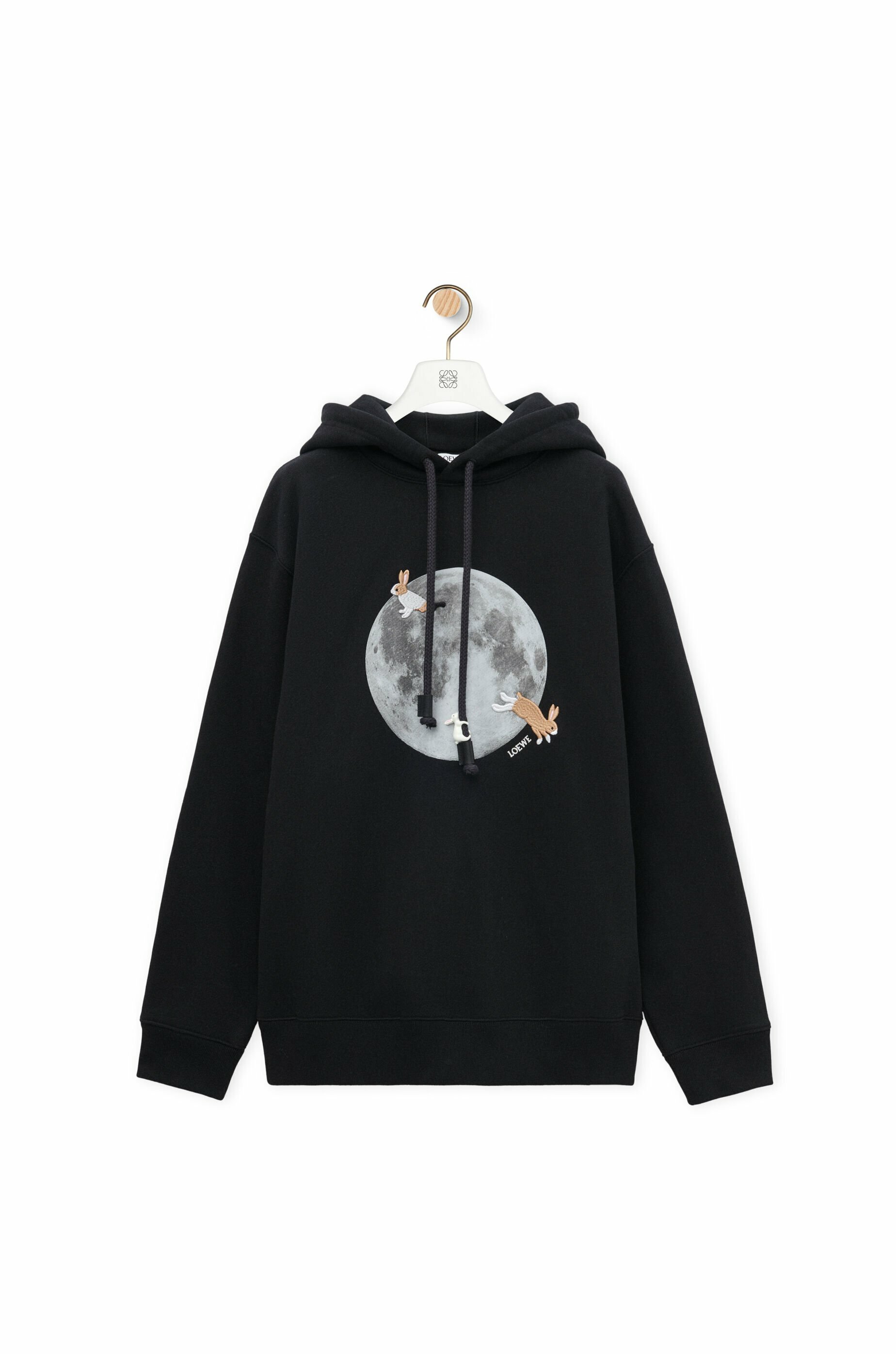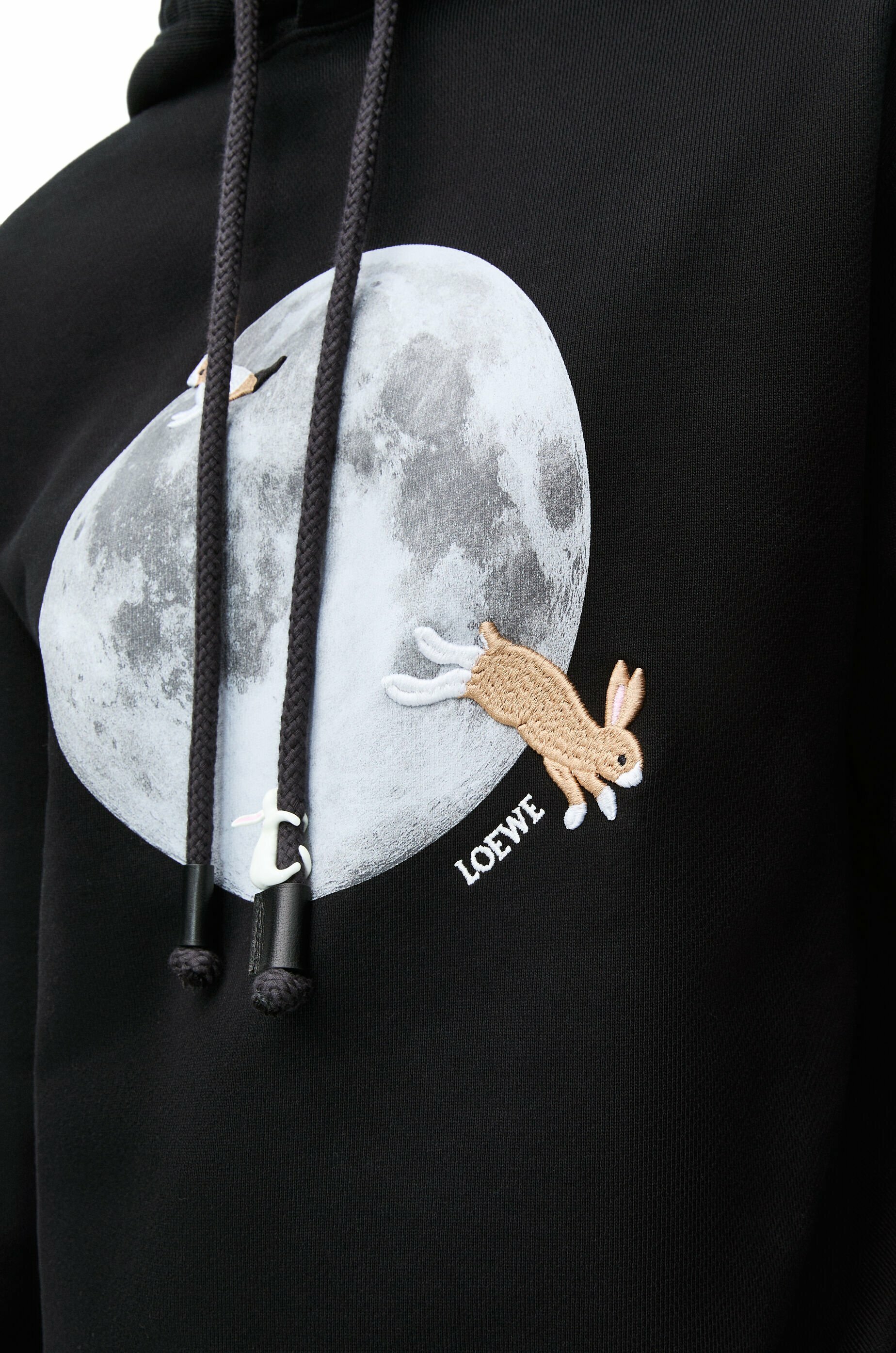 -hooded collar with brass and enamel bunny charms on the drawstring and an anagram embroidery