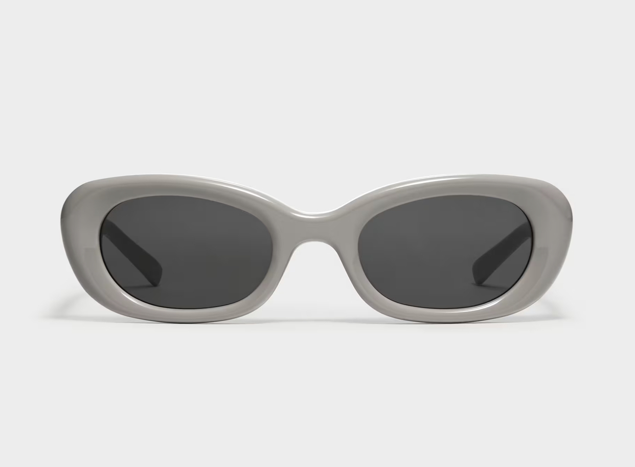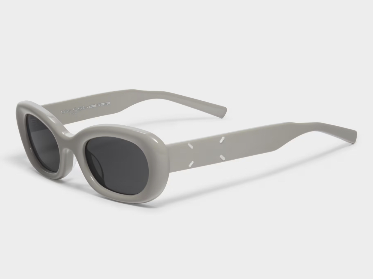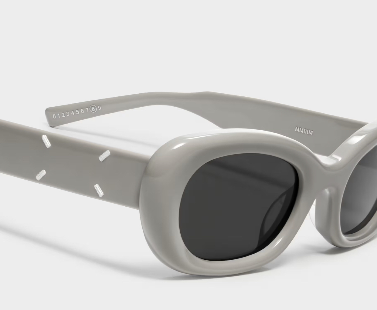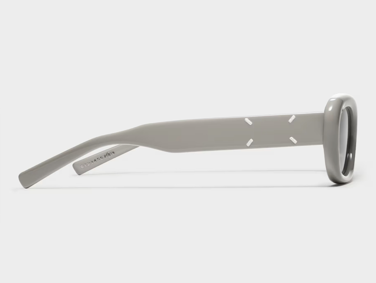 The MM004 G10 sunglasses feature a butterfly silhouette structured from subtle gray acetate. The sides are adorned with real threaded details of Maison Margiela’s four white stitches, and the tip of the inner left temple is embellished with the Maison Margiela's numeric logo with 8 encircled.