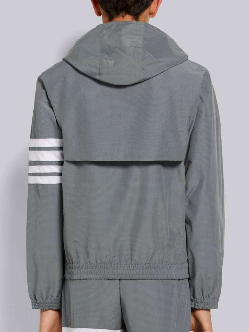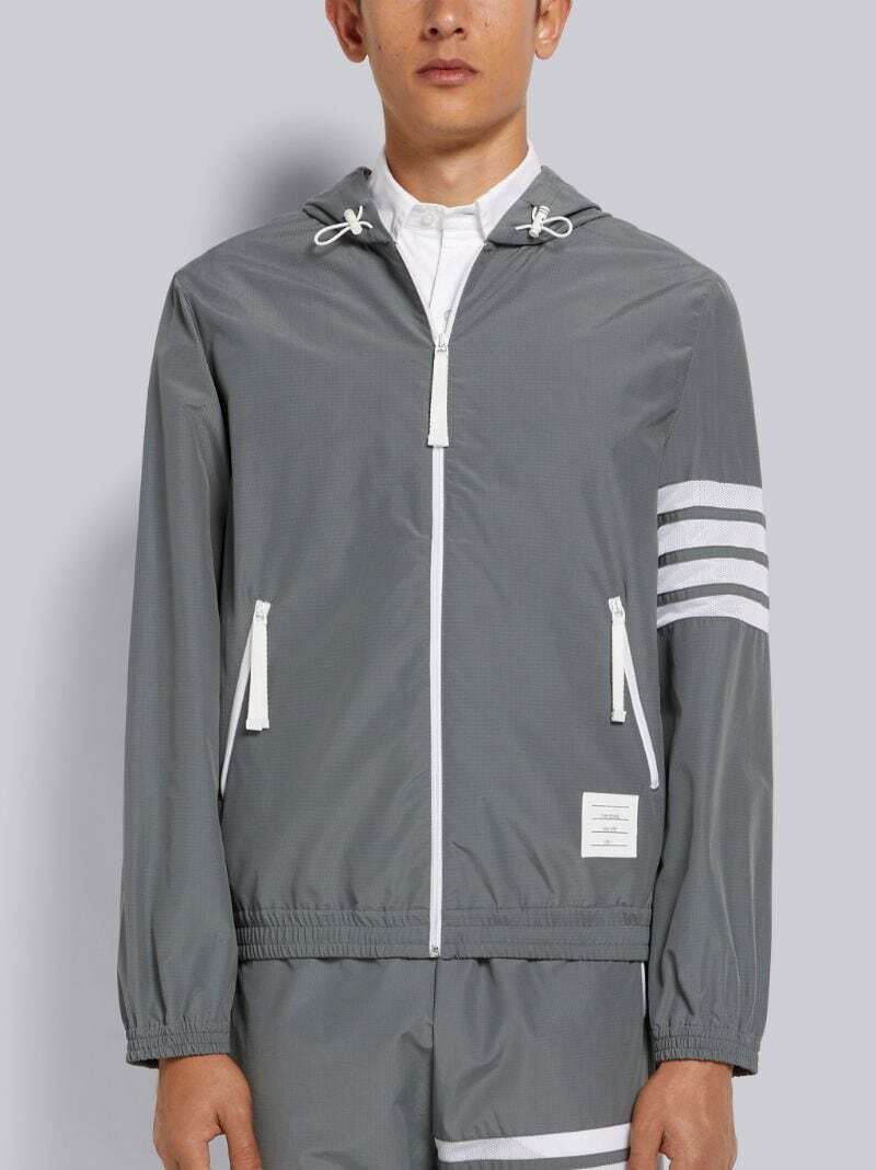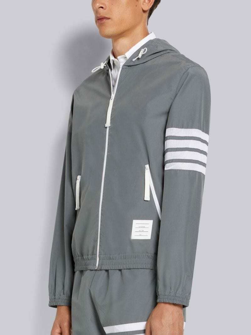 Hooded zip up jacket in medium grey sustainable ripstop mesh with 4-bar stripe detail at left sleeve in white. Zip front closure, 2 zip pockets, drawstring hood, name tag applique above hem. Elastic cuffs and hem. Storm flap at back.