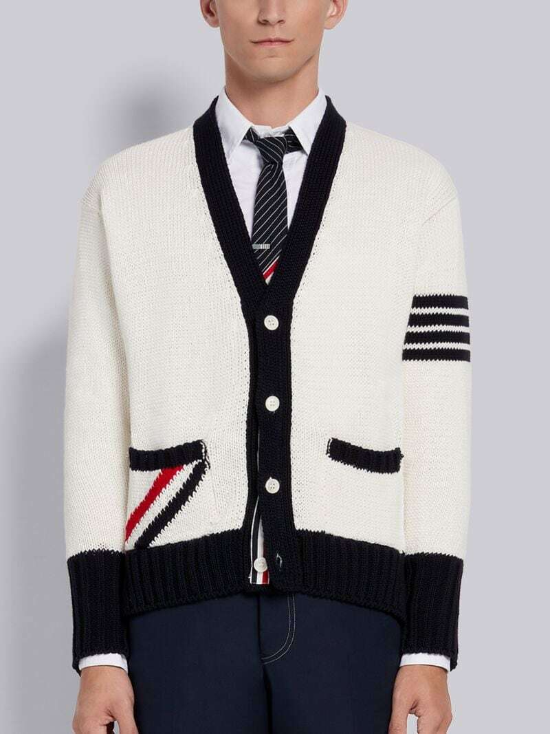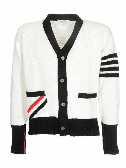 Description:-White V-Neck Cardigan-Cotton Jersey-Multicolor Intarsia Stripe Pocket-Navy Intarsia 4-Bar Stripe-Navy Ribbed Hem & Neckline-Nevy Ribbed Cuffs-Signature Grosgrain Trim-Signature Grosgrain Loop TabStyle id: MKC332AY